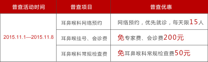 据临床观察统计,初冬时节多数过敏性鼻炎患者都对此病症不够重视,大多数还抱着“能忍则忍”的态度。这样病情逐渐加重,专家表示,初冬时节,最好做一个耳鼻喉的筛查,防患于未然。为了提高患者的就医意识,重视耳鼻喉健康的重要性,贵州省第二人民医院特举办“情暖初冬”耳鼻喉大型公益普查活动,为广大患者献上健康的希望!(活动时间:2015.11.1—2015.11.8)