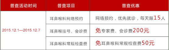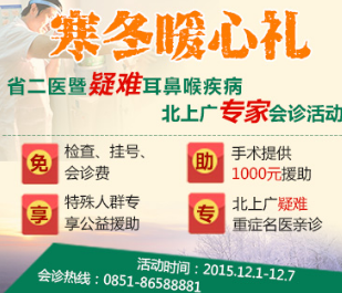 冬天的脚步已经悄悄来临,耳鼻喉疾病也在蠢蠢欲动进入高发时期,面对一再高发的耳鼻喉疑难疾病 ,贵州省第二人民医院“寒冬暖心礼”暨疑难耳鼻喉疾病北上广专家会诊活动及时送暖,为广大患者献上健康的希望!告别疾病困扰!(活动时间:2015.12.1—2015.12.7)