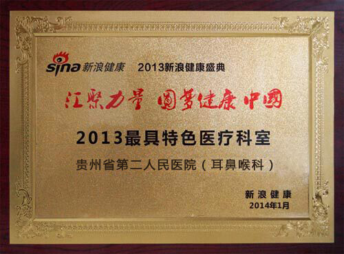 2014年1月6日,由新浪网、新网健康频道举办的“汇聚力量,圆梦健康中国”——2013健康盛典大型活动在北京五洲皇冠假日酒店隆重举行,来自全国的医疗界专家学者、机构领导、媒体精英齐聚一堂,贵州省第二人民医院耳鼻喉医院被评为“2013最具特色医疗科室”。