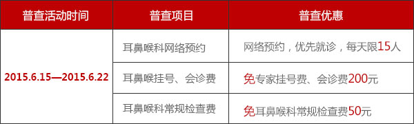 “喜迎端午,感恩父亲”耳鼻喉公益巡诊活动特为耳鼻喉患者开通网络提前预约通道。同时,根据患者咨询,30分钟问诊,3个月跟踪服务,建立长期健康档案。为保证患者就医质量,网络预约每天限15人。