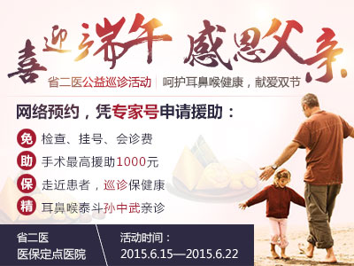 为了给这温情六月增添一份爱心,为了解决广大耳鼻喉患者“看病难、看病贵”的问题,提高患者的就医意识,重视耳鼻喉健康的重要性,贵州省第二人民医院以仁者之心,医者之态,特举办一场大型“喜迎端午,感恩父亲”耳鼻喉公益巡诊活动,为广大忽视治疗或盲目治疗却久治不愈的耳鼻喉患者开启一扇走向健康的大门,献爱六月双节!(活动时间:2015年6月15日—6月22日)