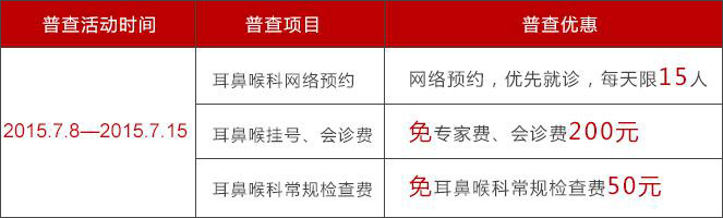 活动公示:本次公益直通车时间定于(2015年7月8日~7月15日),针对7-70岁的耳鼻喉患者,可通网络预约,申请援助。对重大疑难病症,将联合北上广权威医院耳鼻喉主任或学科带头人采取“三级会诊制度”。