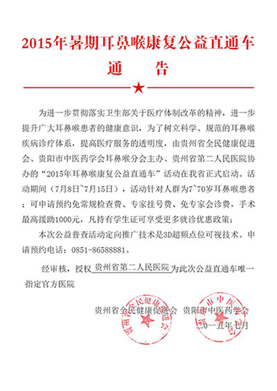 贵州省第二人民医院以仁者之心,医者之态,将有效解决老百姓“看病贵、看病难”的问题为目标,推出2015暑期耳鼻喉康复公益直通车活动,在暑期给与特殊人群(贫困、残疾人群等)更温情援助,切实解决患者的需求。