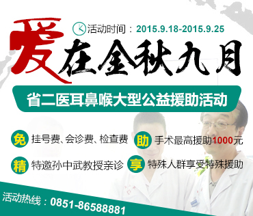 步入秋季以后,细菌、病毒的繁殖速度加快,耳鼻喉疾病的侵袭甚至比以往更加严重,针对秋季耳鼻喉高发的现状,为早日让更多患者摆脱耳鼻喉疾病痛苦,健康过秋。同时提高市民对耳鼻喉疾病预防和诊治工作的规范化认识和重视度,真正将惠民利民政策落实到实处。贵州省第二人民医院特开展“爱在金秋九月”鼻喉大型公益援助活动,特聘北上广专家联合坐诊,誓以精湛技术,公益援助,保障耳鼻喉患者健康。(活动时间:2015.9.18—2015.9.25)